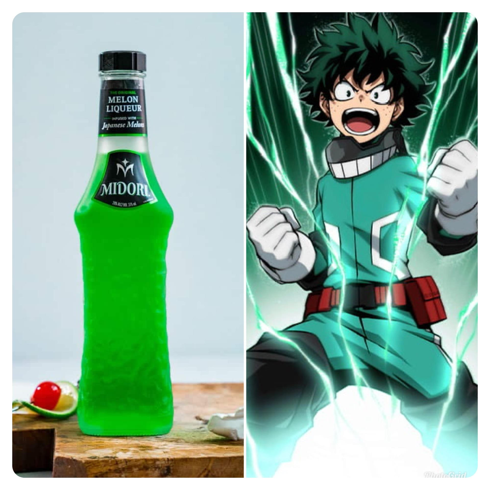 Midori is the softer counterpoint—sweet, bright, and unmistakably melon-forward. (And yes, its name simply means “green” in Japanese—not to be confused with the green-haired anime hero from My Hero Academia.) Made from cultivars like Yubari King melons, it supplies both the sweetness and much of the emerald color in this cocktail.